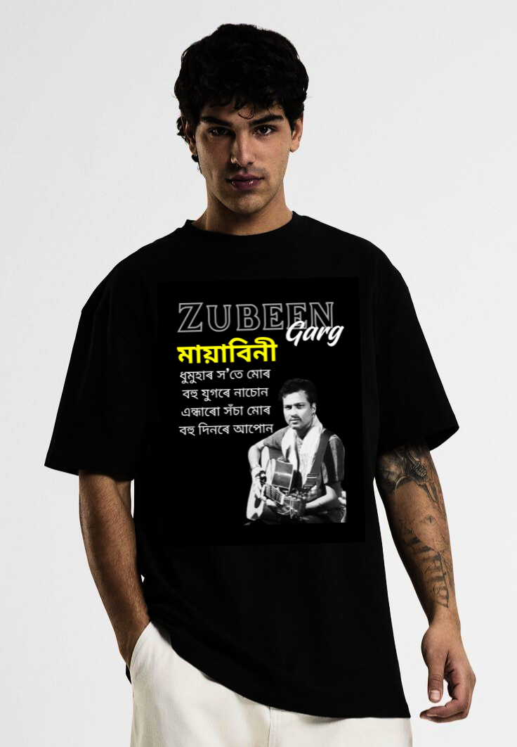 • Iconic Lyrics: The shirt features the profound and soulful lyrics of Zubeen Garg's popular song, "Mayabini" (মায়াবিনী), beautifully rendered in the original Assamese script. The words capture a deep, timeless connection: ​"ধুমুহাৰ স'তে মোৰ / বহু যুগৰে নাতোণ / এক্কাশ্বৰ সঁচা মোৰ / বহু দিনৰে আপোন" (My connection with the storm / Is from many eras / One true word / Is my long-time darling.)