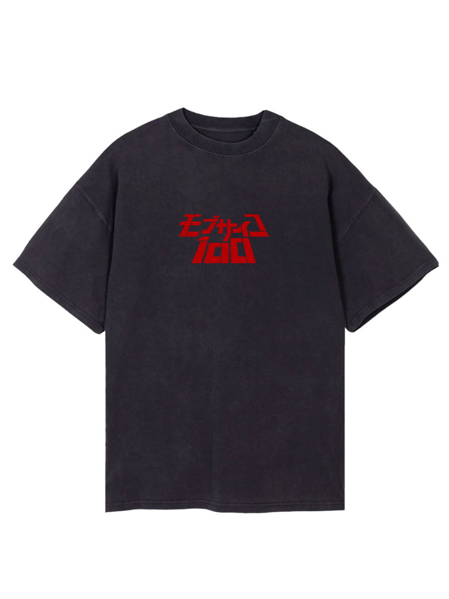 The image shows a black, oversized t-shirt featuring a graphic design inspired by the anime series Mob Psycho 100.